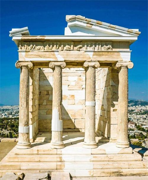 作为古希腊建筑的代表作,雅典卫城达到了古希腊圣地建筑群、庙宇、柱式和雕刻的超高水平。帕特农神庙是卫城内超大的、建筑时间很早的建筑,供奉智慧女神雅典娜,在古希腊神话中,智慧女神雅典娜是城市的守护神,雅典的名称也由此而来。