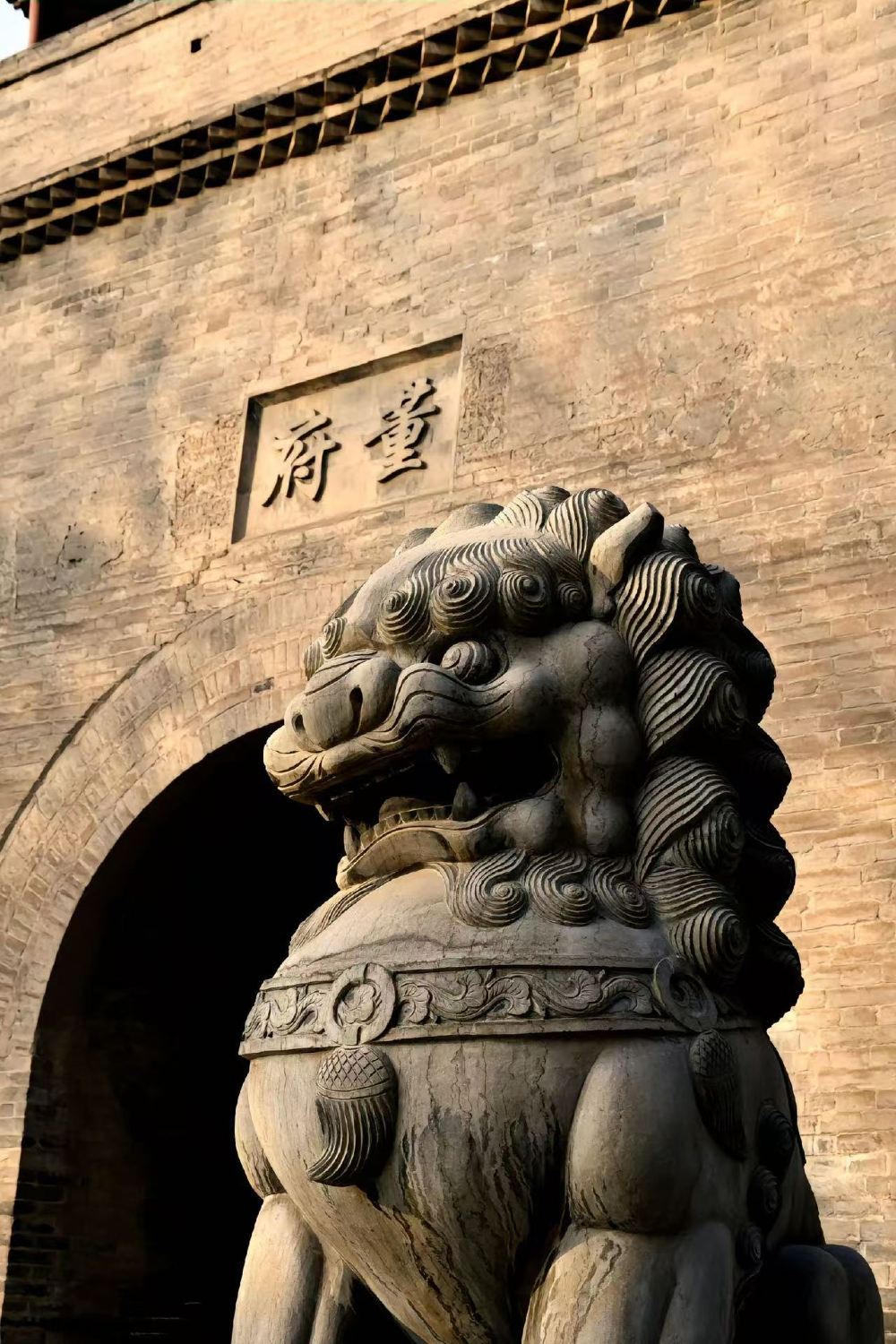 ▲ 画面主体是一尊雕刻精美的石狮子,其毛发呈螺旋状卷曲,双目圆睁,张嘴露齿,神态威严;颈部装饰着繁复的花纹与缨络,线条流畅细腻,尽显传统雕刻工艺的精湛。石狮子身后,是董府的砖筑墙体,墙体上方嵌有 “董府” 匾额,字迹古朴苍劲。墙体的拱形门洞与砖石纹理,在光影交错下更显岁月质感。整体画面融合了威严的守护神兽与古朴的建筑元素,传递出董府作为历史建筑的庄重底蕴,仿佛在诉说往昔的故事,令人感受到浓厚的历史文化氛围。