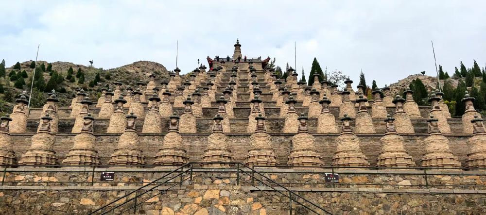 ▲ 宁夏青铜峡著名的 108 塔,塔身以砖石筑成,呈棕褐色,分十二层阶梯式依山而建,按奇数序列错落排列,构成等腰三角形的庄严布局。塔顶黑色塔刹简洁醒目,与古朴塔身形成对比。塔群底部是石砌基座,搭配金属护栏,既守护古迹又便于参观。背景中,山体覆稀疏植被,几株苍松点缀,天空云层弥漫,为千年古迹渲染出肃穆氛围,尽显历史沧桑与佛教文化的深厚底蕴。