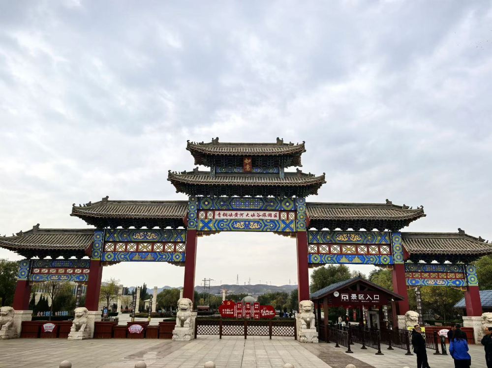 ▲ 飞檐翘角的灰瓦屋顶古朴庄重,红色立柱坚实稳重,横梁与斗拱处点缀蓝、绿、金等色彩的精美纹样,细节处尽现传统工艺的精巧。牌坊上方红色匾额醒目写着 “青铜峡黄河大峡谷旅游区”,点明景区身份。 牌坊前左右两侧,石狮子威严镇守,增添庄重感;底部是开阔的石板广场。背景中,云层密布的天空与远处连绵山脉勾勒出自然的辽阔,右下角 “景区入口” 标识建筑旁,游客身影若隐若现,既传递出历史文化的厚重底蕴,也营造出迎接游客的热情氛围,仿佛在宣告一场峡谷探秘之旅即将开启。