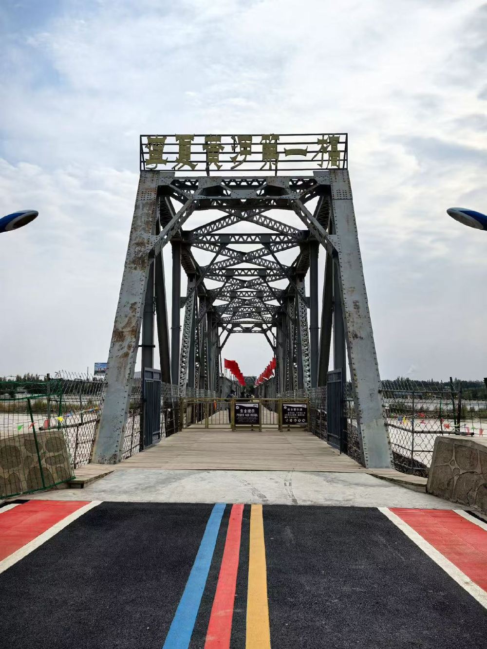 ▲ 桥梁主体由金属钢架搭建,结构坚固,钢架表面的锈迹诉说着岁月故事,尽显历史厚重感。桥体上方,“宁夏黄河第一桥” 的金属字样醒目矗立,点明其特殊地位。桥面前端铺设彩色路面,红、蓝、黄等线条交织,为古朴桥梁注入现代活力。桥两侧路灯与围栏规整有序,远处桥身延伸,悬挂的红色旗帜随风轻扬,与蓝天白云、开阔的周边景致相互映衬。整幅画面既承载着黄河畔的历史记忆,又焕发着庄重而鲜活的气息,仿佛在娓娓道来过往岁月中的交通变迁与地域故事。