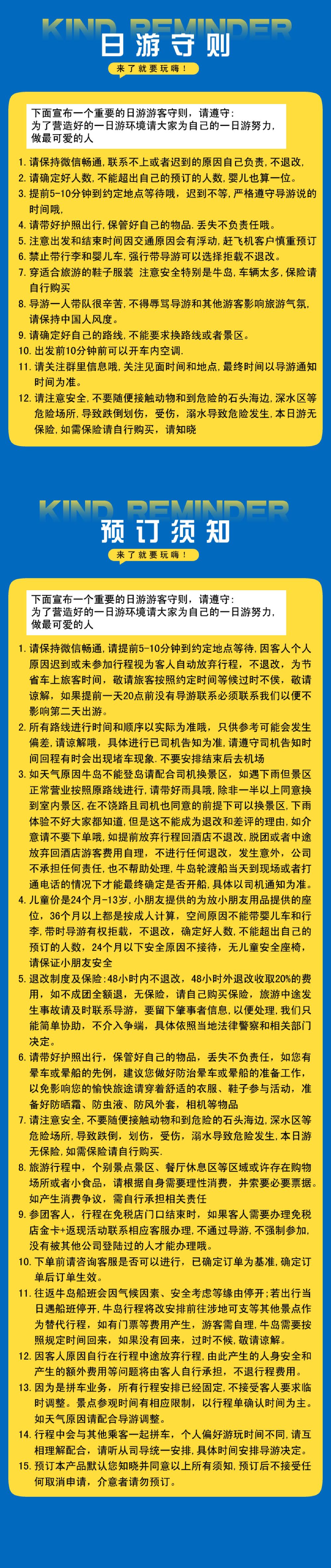 因为是拼车团,座位有限,安排好就不会再接受其它客人,所以个人原因迟到或者未参加行程,视为自动放弃,恕无法以此为由要求取消或退款,敬请理解!
