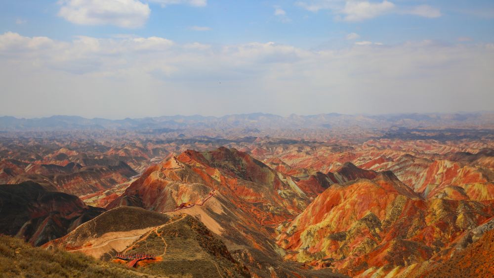 7、翠峰澜天:较高处的这个观景平台,我们可以看到左侧绝壁丹霞、与右侧的彩丘峰峦所形成鲜明的对比