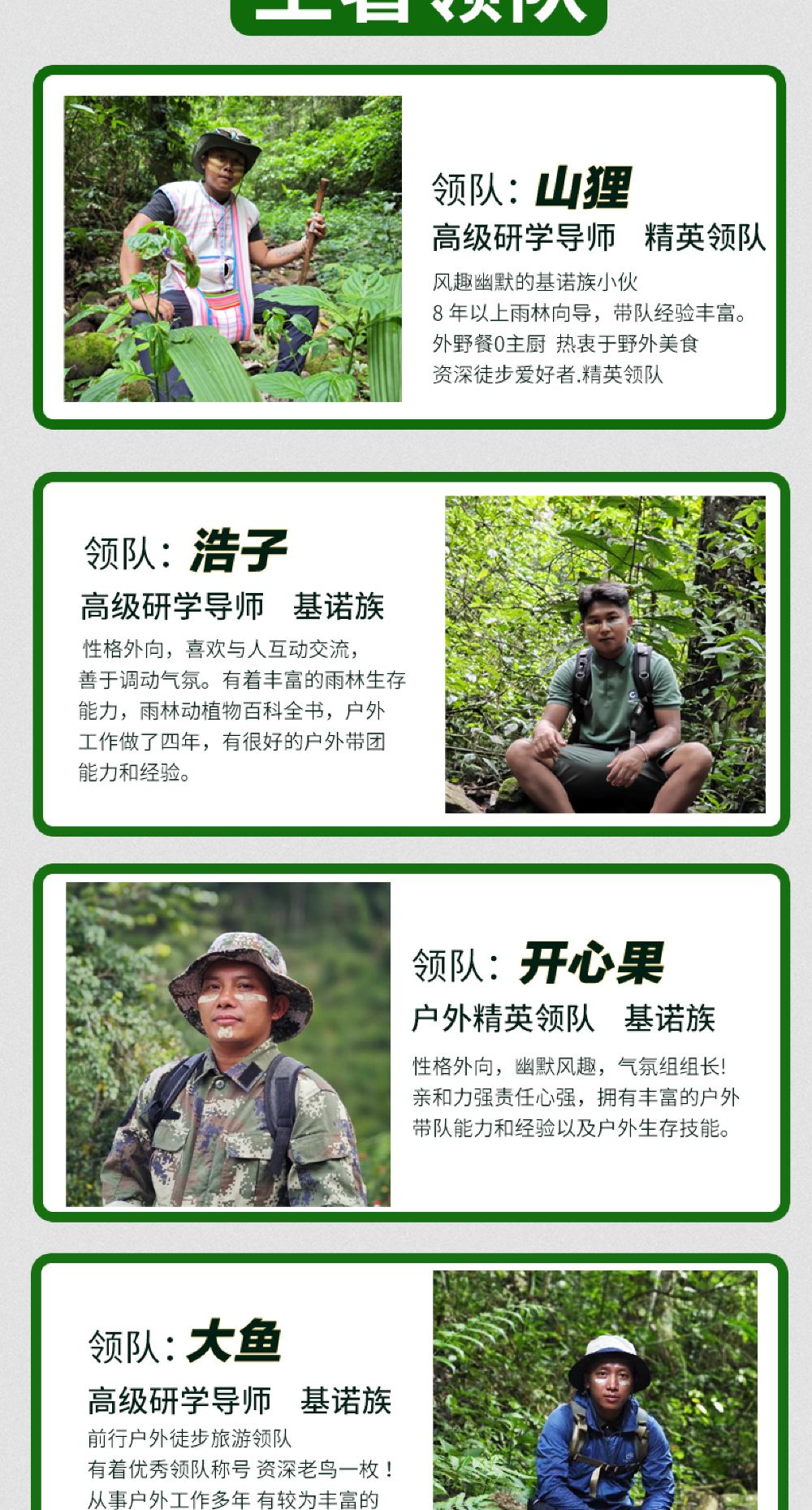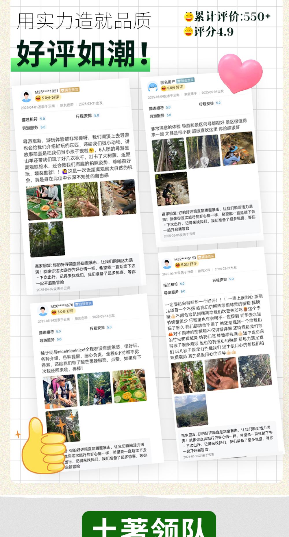 温馨提示:抓螃蟹、尝酸蚂蚁、野果、昆虫科普。这些都属于季节性和运气概率问题,若因不可控天气和季节因素没有体验到此项目,我司将不会做出赔偿和解释,建议的勿拍~