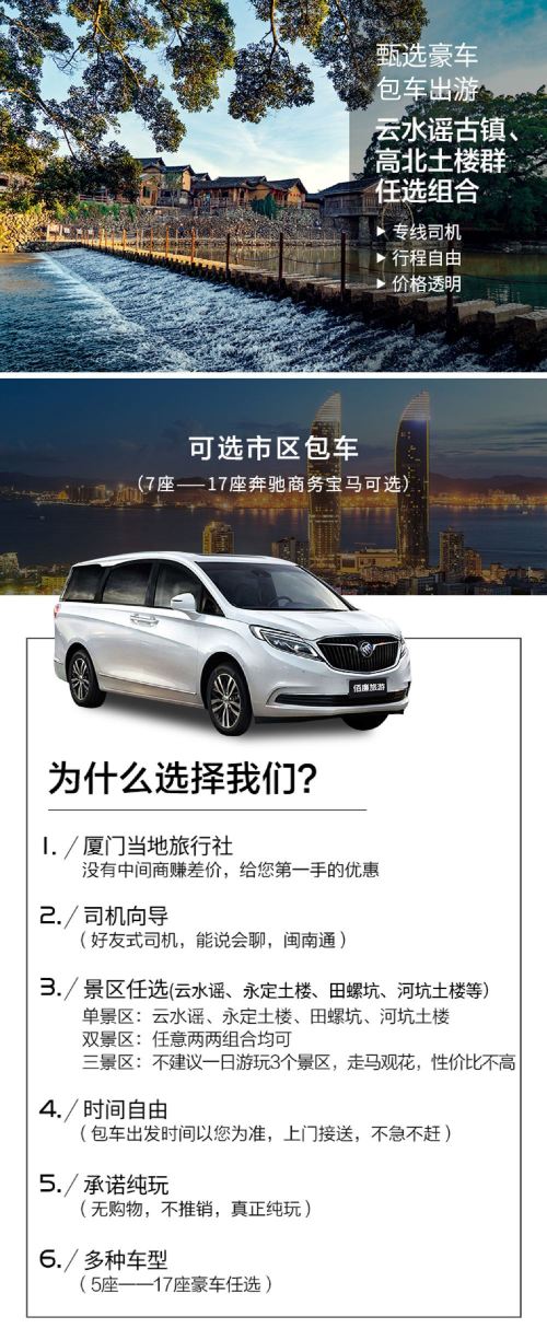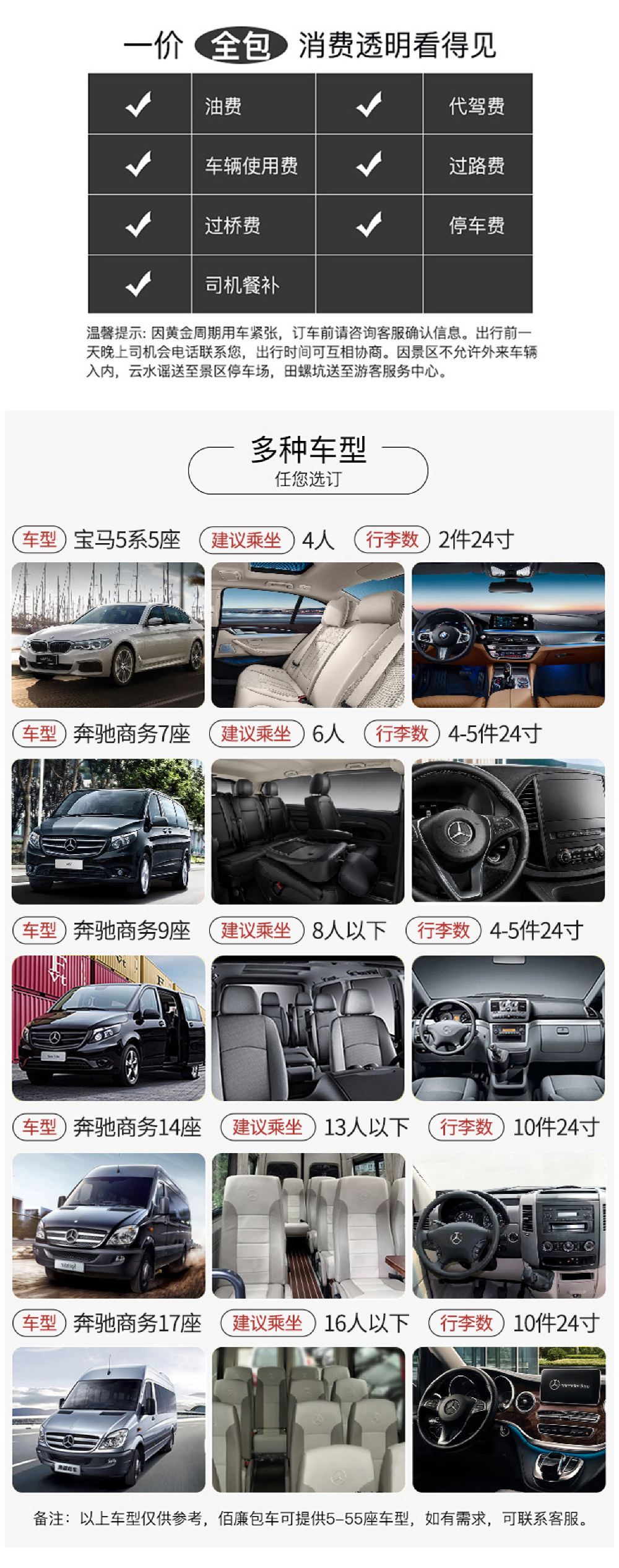 行程安排:时间顺序仅供参考,车辆按人数配备同级车(页面车型仅供参考,不指定具体车型,车辆紧张时将替换同级别品牌车)