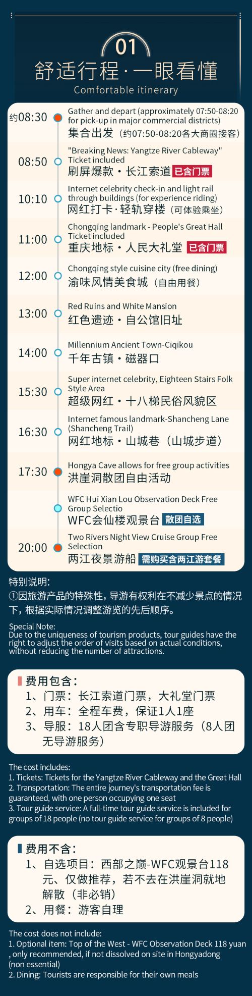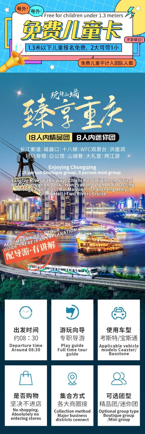2、线路已含长江索道门票30元,大礼堂门票+讲解25元。