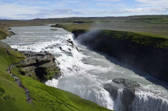 ▲ 断层峡谷瀑布,从鬼斧神工的断层倾泻而下的瀑布,溅出水珠弥漫在天空,在阳光照射下形成道道彩虹, 仿佛整个瀑布是用金子锻造成的,景象瑰丽无比。(如果天气晴朗,还可以看到冰岛第三大冰川朗格冰川)。