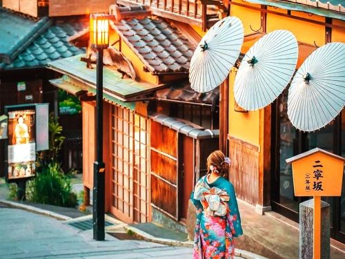 ▲ 三年坂二年坂是通往清水寺的小石头坡道,与清水坂一样是历史保护街区。这一带道路的两侧都建有木质结构的老房子,开设了饼屋、纪念品商铺、京都特产古风瓷品店等,也有茶屋和咖啡馆。二年坂从北面的高台寺往南延伸至三年坂,长约200米。走在曲径通幽的石板坡道上,一路连绵着保留了红壳格子和虫笼窗式的古老町家建筑,极具韵味。