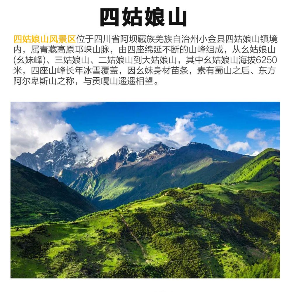 早上统一集合出发,上午经都江堰,沿都汶高速经映秀、卧龙自然保护区,前往[猫鼻梁]观四姑娘山四大主峰全景,这里是观赏拍摄四姑娘山全景的醉佳位置(停留时间约30分钟)