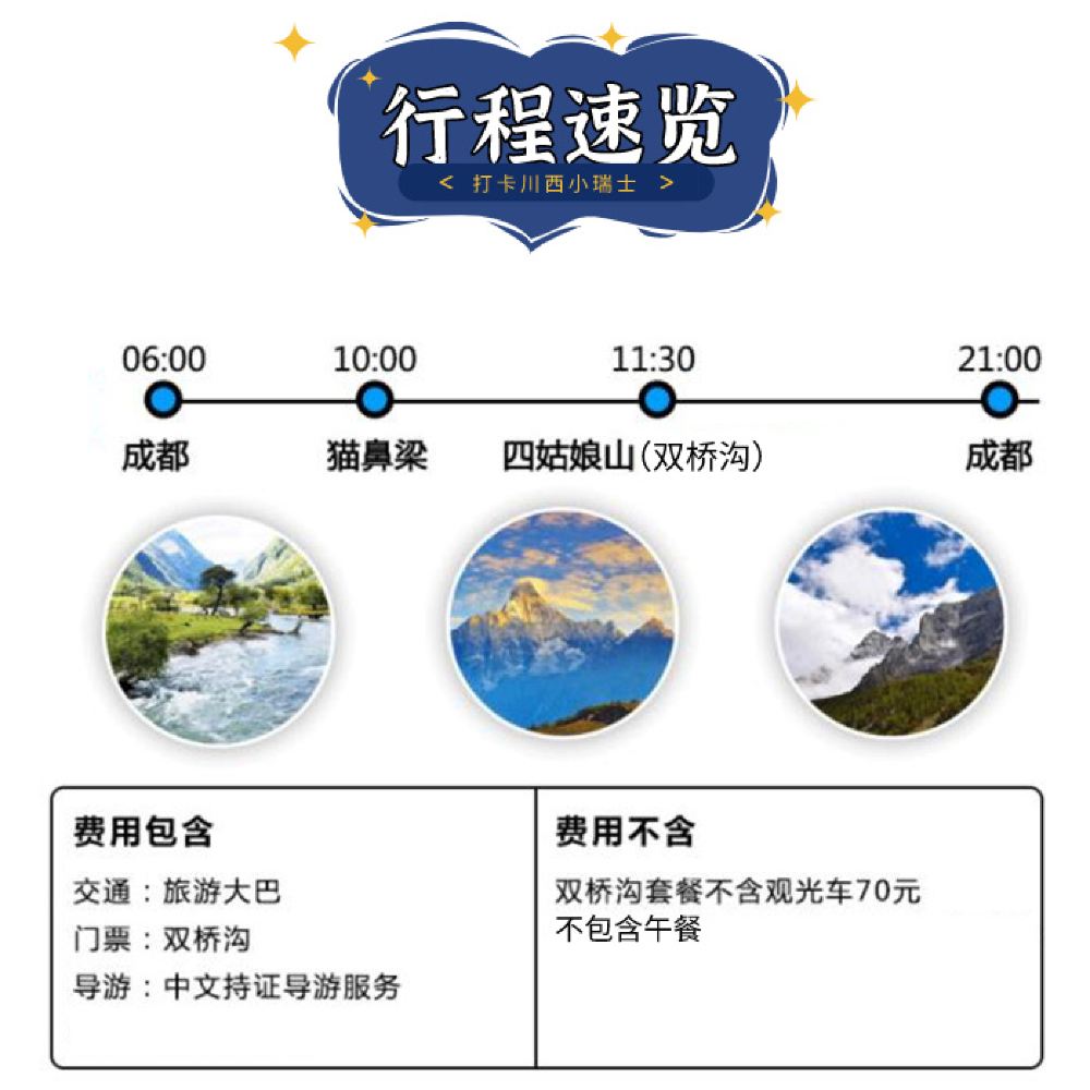 猫鼻梁参观结束后驱车到达四姑娘山镇游览[双桥沟](观光车70元报价不含,费用自理景区配套设施,必须乘坐),(双桥沟全程34公里,乘观光车游玩,在景点有车站,需到站上下车,每辆观光车上均有讲解导游,因每位游客在每个景点停留的时间不一样,很容易走散,故在景区内导游不可能陪到每一位游客,请各位游客理解!)双桥沟沟内主要以雪峰、牧场、草地、森林等为主,是四姑娘山醉美丽的一条沟。漫步沟内,可体验到真正的牧区风光。主要景点有阴阳谷、猎人峰、日月宝镜和五色山沙棘林道、牛棚子、牛心山等景点等。游览结束后返回成都,结束行程!