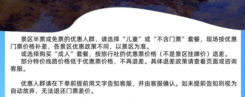 特别申明: 1、是否免票或半票人群,优免证件需景区认可,以景区核定为准。