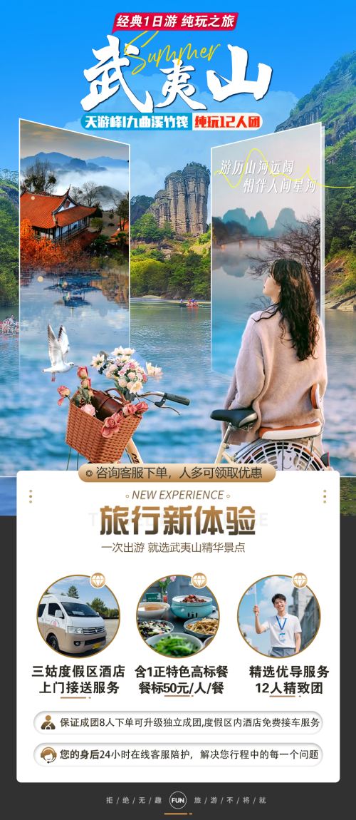 精选九曲溪竹筏漂流、天游峰、武夷宫三大核心景点,串联山水奇观与人文底蕴,一站式解锁武夷山精华体验。
