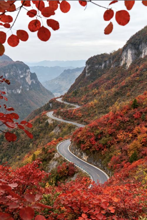 ▲ 红叶季专属体验:11月前后,天路两侧红叶层林尽染,车行红色隧道中,视觉冲击力极强