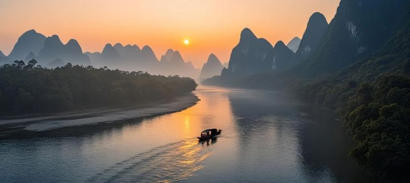 ▲ 天边初露的晨曦,如同一位画家,轻轻挥洒着金色的颜料,将漓江从沉睡中温柔唤醒。江面宛如一面巨大的镜子,静静地映照着天边变幻的云彩,一叶孤舟悠然漂浮其上,仿佛是大自然特意放置的诗意点缀。