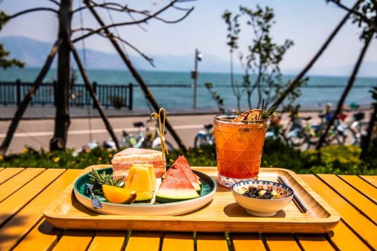 ▲ 藤编篮盛满阳光,白瓷杯斟着风花雪月。 浪花在脚边碎成诗句,水性杨花在玻璃盏里漾开涟漪。 芝士蛋糕的柔滑撞上果茶的清甜,此刻, 苍山是茶席上的镇尺,洱海是杯中晃动的鎏金。