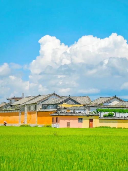 ▲ 转角遇见飞檐翘角的照壁,风吹过稻田翻涌成海。 严家大院的六合同春雕花藏着商帮传奇,喜林苑的黄墙外, 扎染蓝飘向苍山,麦浪在四季轮回中书写田园诗。