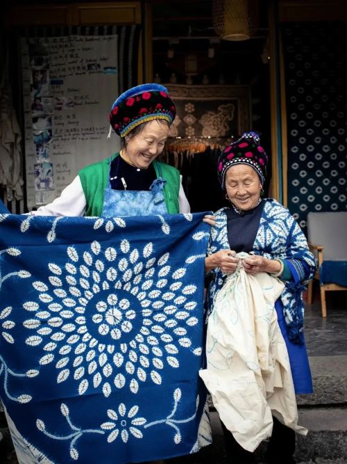 ▲ 板蓝根的汁液在陶缸中发酵, 白棉布被麻绳捆扎成未知的星云。 浸染、氧化、拆解—— 蝴蝶从褶皱中破茧,洱海的波纹在指尖凝固成永恒。