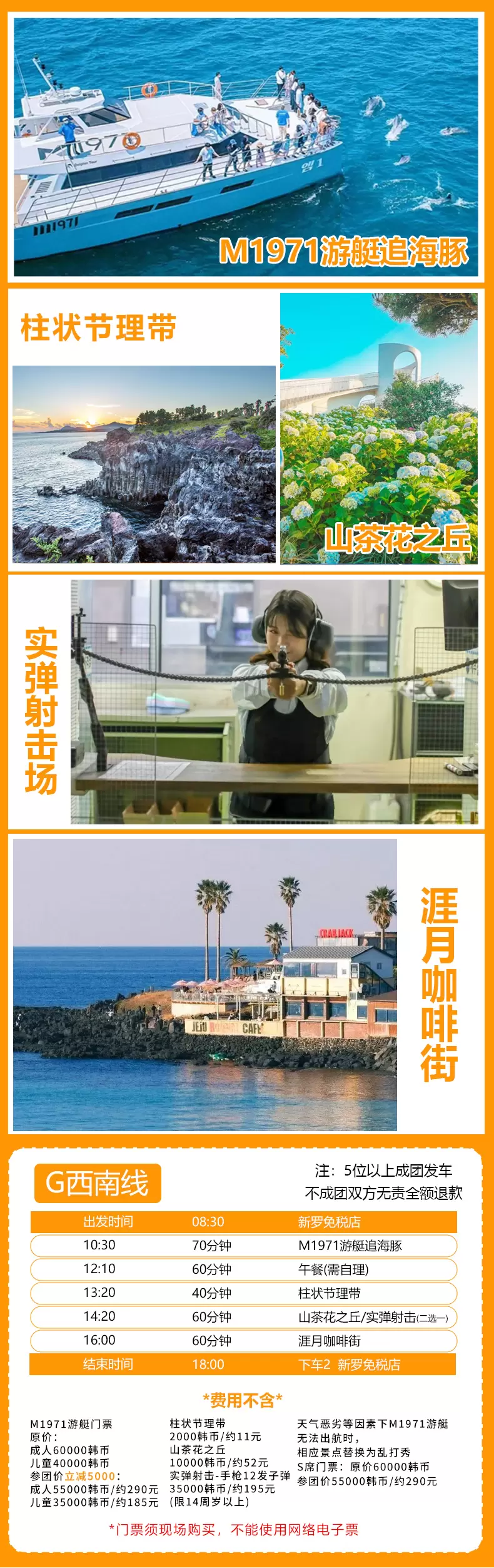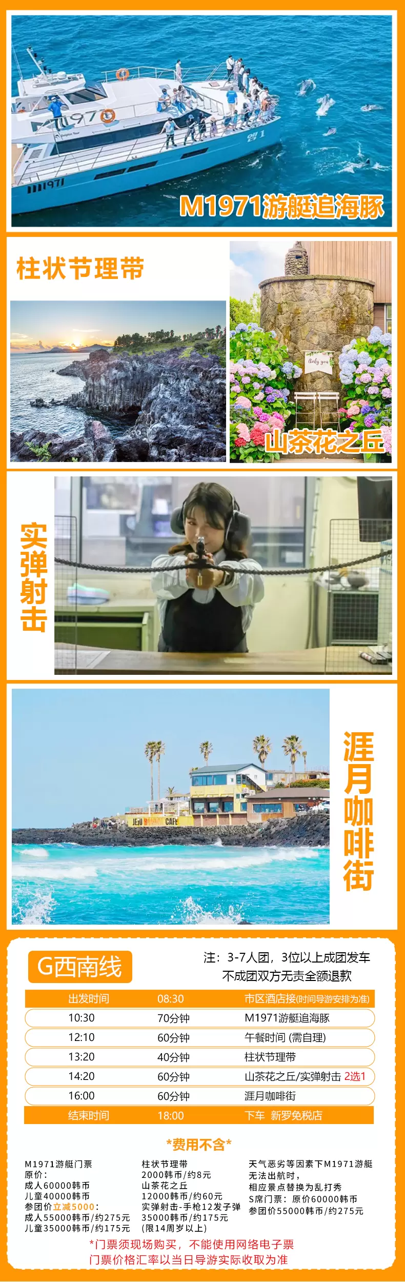 济州岛M1971 游艇俱乐部+柱状节理带+山茶花之丘+济州实弹射击场+涯月海岸道路一日游【济州岛一日游】