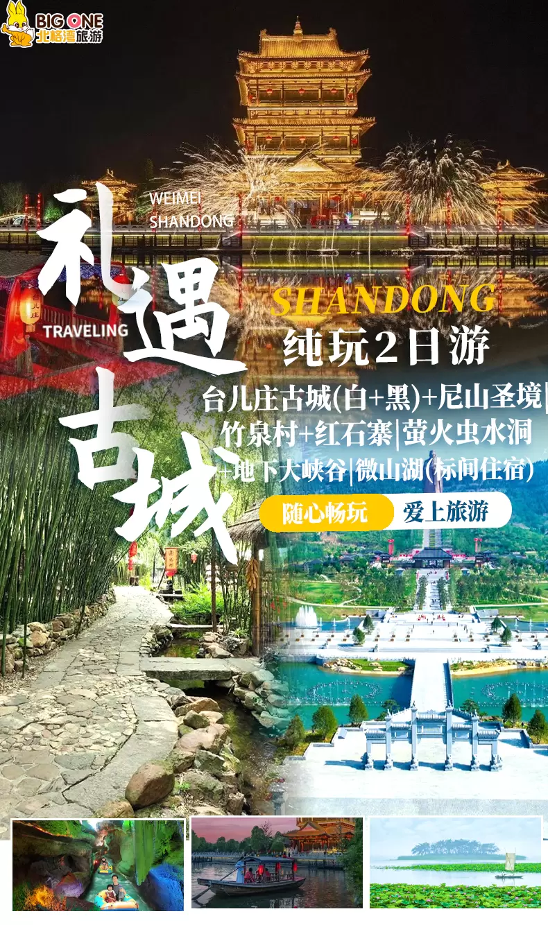 枣庄台儿庄古城二日游【烟台出发-尼山圣境/微山湖/地下大峡谷/萤火虫水洞/竹泉村/红石寨】
