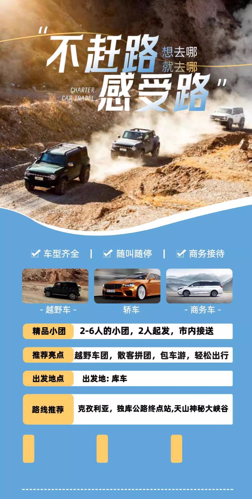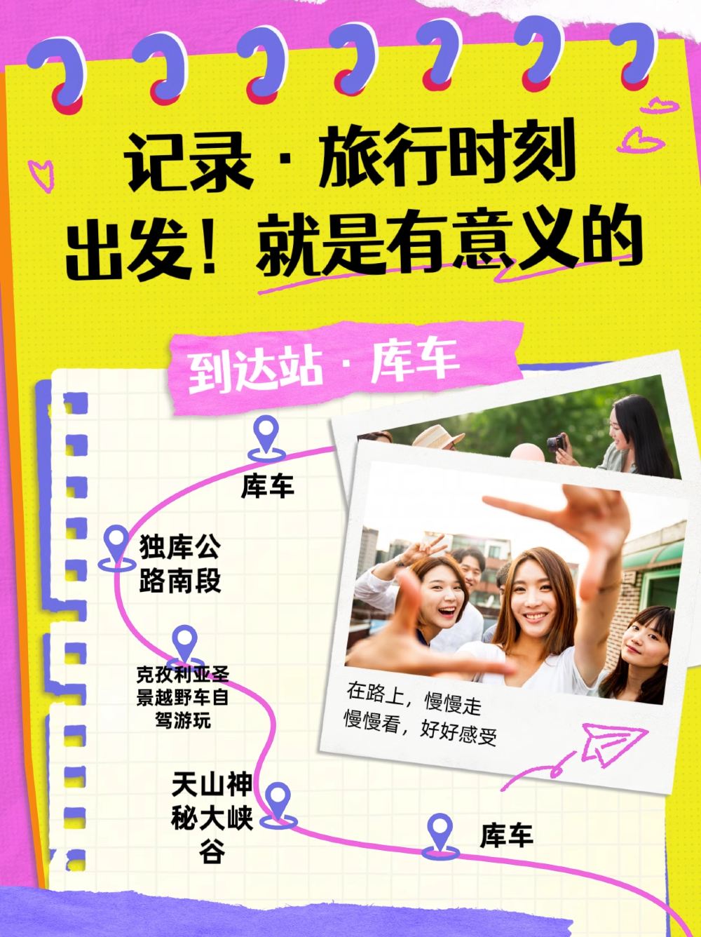 特别提示:独库公路南段70公里左右,库车至天山神秘大峡谷那一段,每一年四季都开着,正常发团,天天发团!根据人数安排车