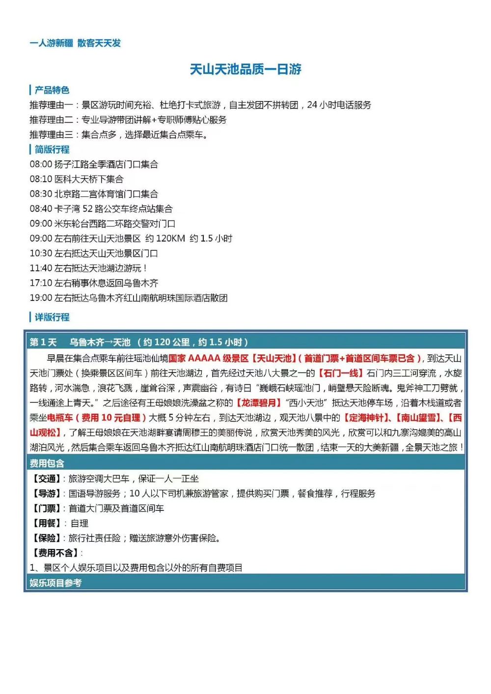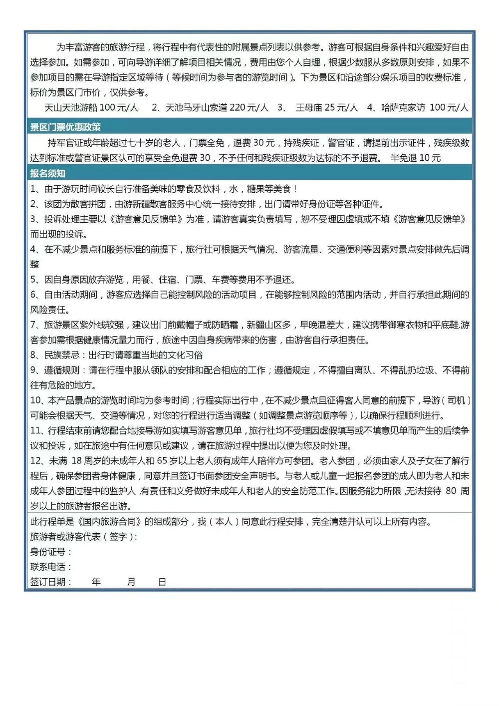▲ 为丰富游客的旅游行程,将行程中有代表性的附属景点列表以供参考。游客可根据自身条件和兴趣爱好自由选择参加。如需参加,可向导游详细了解项目相关情况,费用由您个人自理,根据少数服从多数原则安排,如果不参加项目的需在导游指定区域等待(等候时间为参与者的游览时间)。下为景区和沿途部分娱乐项目的收费标准,标价为景区门市价,仅供参考。 天山天池游船100元/人 2、天池马牙山索道220元/人 3、 王母庙25元/人 4、哈萨克家访 100元/人