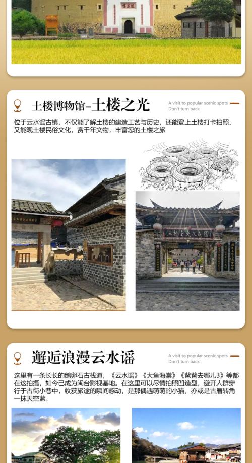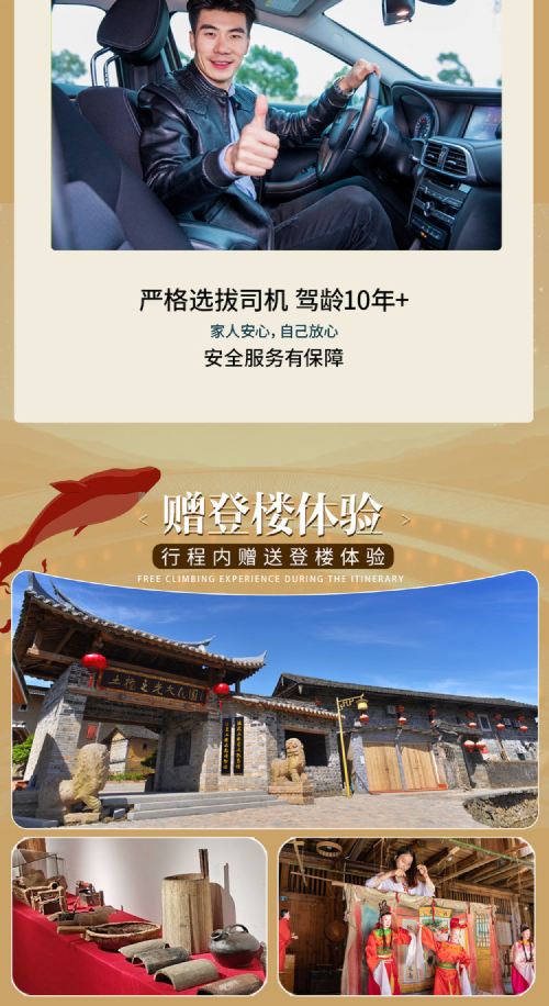 前往土楼往返时间较长,为避免您回程误机或误车,建议当天不安排返程火车/动车、飞机(若确实需要,建议购买动车票晚上20:00以后/飞机航班21:30以后);如因误车或误机所产品费用需自行承担,我司概不负责,造成您的不便,敬请谅解!