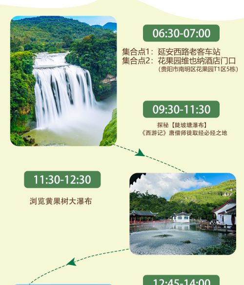 特别提示:行程时间均为参考时间,实际的具体集合时间,地点以导游通知的为准。下单时请选择上车点,若未选择上车点,默认贵阳市云岩区延安西路32号旅游集散中心为上车点