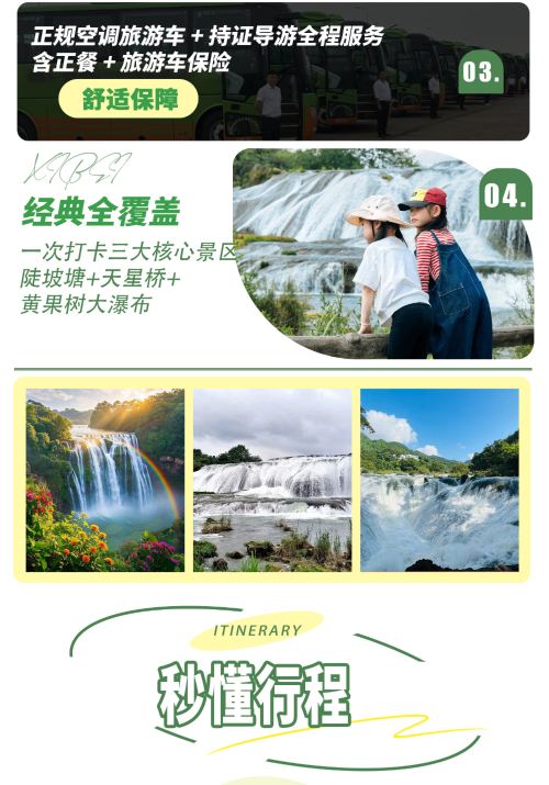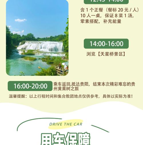 1.【乘车不含餐-A套餐】直通车,常规旅游大巴车,人数最多50人团,只含贵阳到景区往返车位费,其他自理,需自行提前在【微信公众号-搜索黄果树景区】预约08:30-10:30入园门票,当天可能会买不到门票。