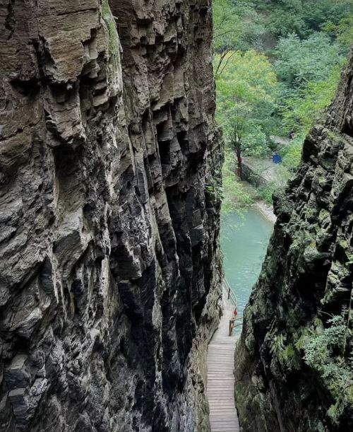 自然景观:景区内有一条长约 11 华里、高约 100 余米、落差达 1000 余米的裂谷长廊,呈东南、西北走向。沿着谷中栈道漫步,两侧峭壁耸立,绝壁对峙,流水潺潺,悬崖峭壁之上林木繁茂,山花烂漫。峡谷中瀑布众多,著名的是 “钟鼓瀑”,其高约百米,水流砸在水中顽石上,水大时像鼓声,水小时像钟声,与山壁回音结合,犹如钟鼓齐鸣。此外,还有许多清澈的水潭和小溪流。