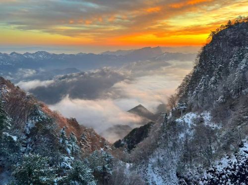 陕西天竺山素有“秦岭奇观”之称,深秋时节,似火燃烧的黄栌、艳若丹霞的枫香与金黄桦树等将千米山峦织就成流动的油画,红、黄、橙、绿层次分明;沿着道路前行,脚下云海翻涌,身旁红叶簇拥,登顶远眺,层林尽染的群山如波浪起伏,清晨薄雾、傍晚夕阳、雨后初霁时的红叶各有风情,11月举办的红叶节更是吸引众多游客前来。