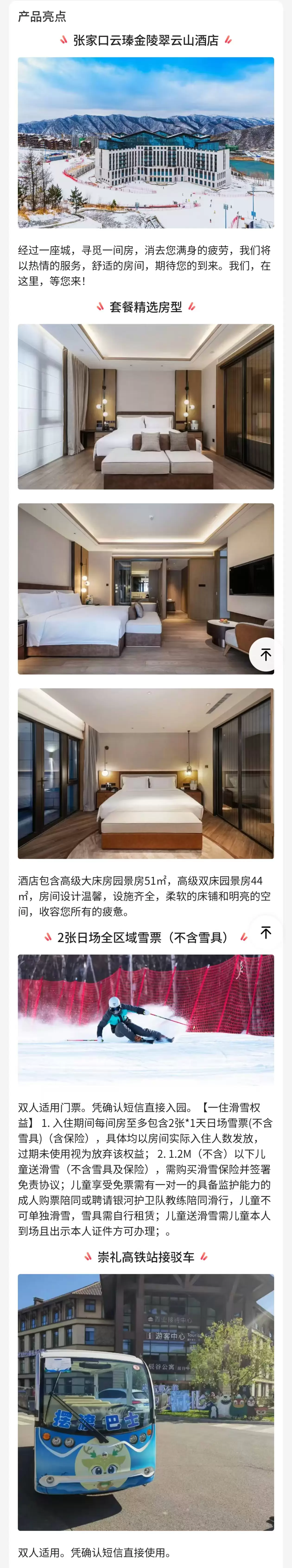 【雪季开板特惠】张家口云瑧金陵翠云山酒店1晚+双人1日雪票(不含雪具)+双人日场缆车票+崇礼站高铁接驳车