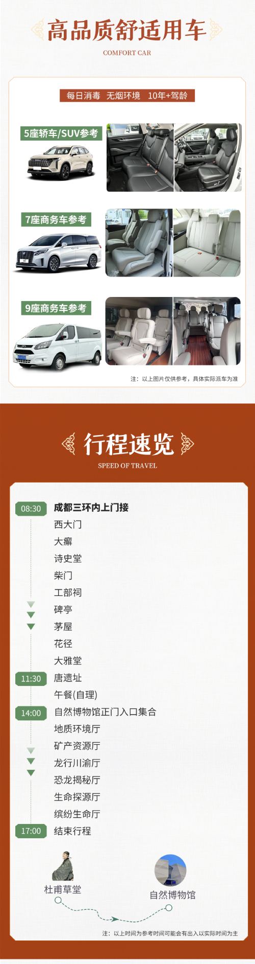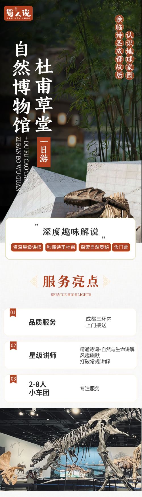 杜甫草堂+成都自然博物馆一日游【小车团 上门接 含讲解】【2-8人精品小车团,成都市区三环内 舒适小车上门接送,品诗歌文化 看自然之美】