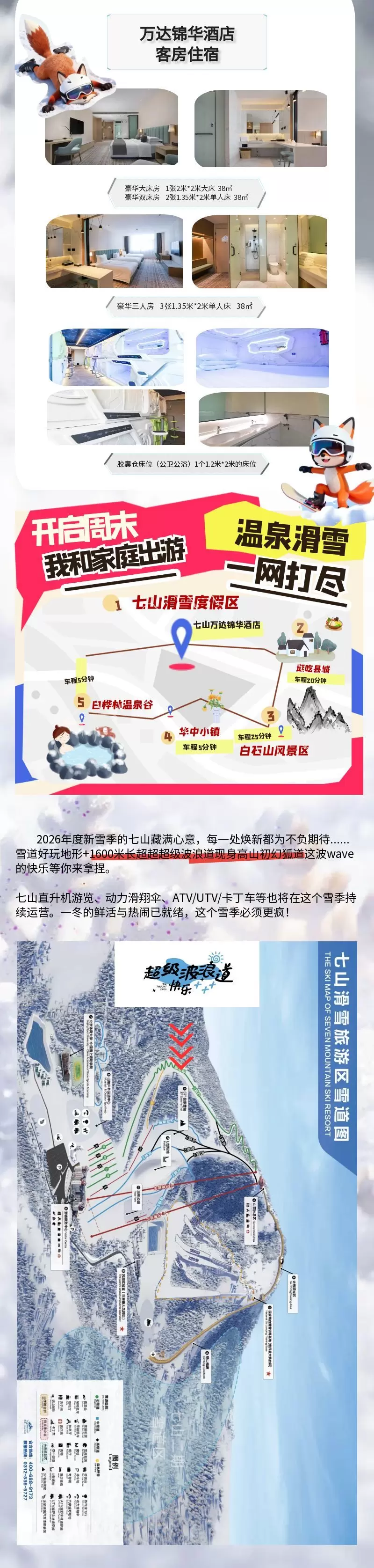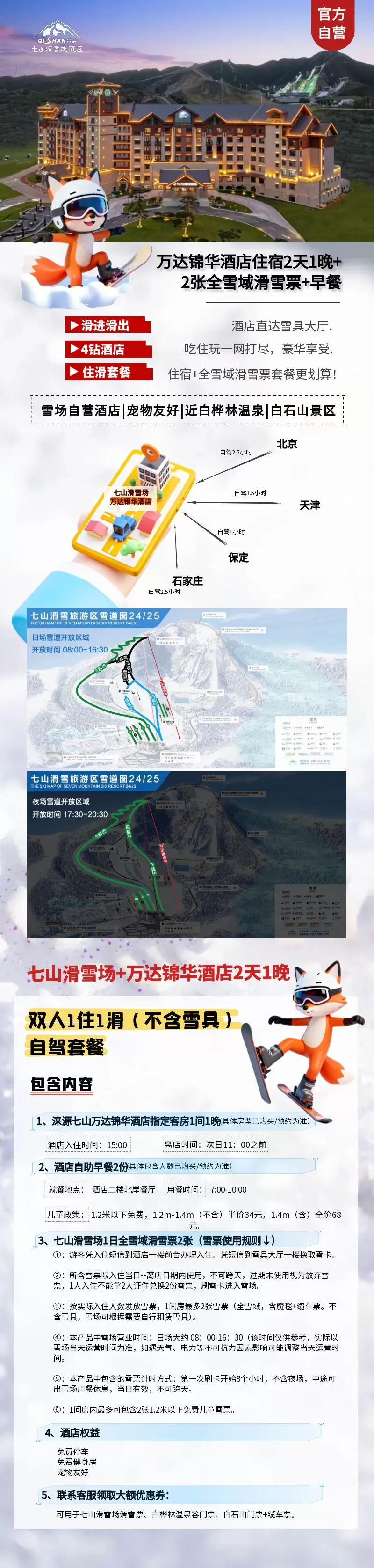 【滑进滑出】七山万达锦华酒店1晚/2晚+2份早餐+七山滑雪场 2人(日场全区域雪票,不含雪具)七山滑雪度假区