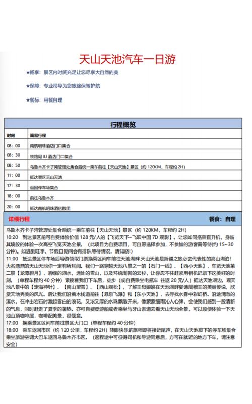 *游玩景点:天池八景 —瑶池部落-马牙山风景区 —高空索道 -博格达峰