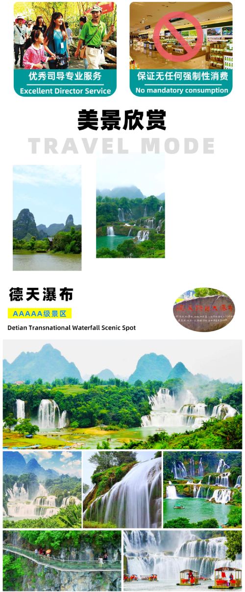 2、不含德天瀑布风景区内电瓶车(单程10元/人)、竹排游览瀑布68元/人、飞天魔毯(50元/人)、高空滑道(50元/人),以上项目属于景区自行经营的项目,如需使用,费用需自理,敬请知晓。德天景区内集市非团队旅游中的自费及购物项目,导游不作推荐。