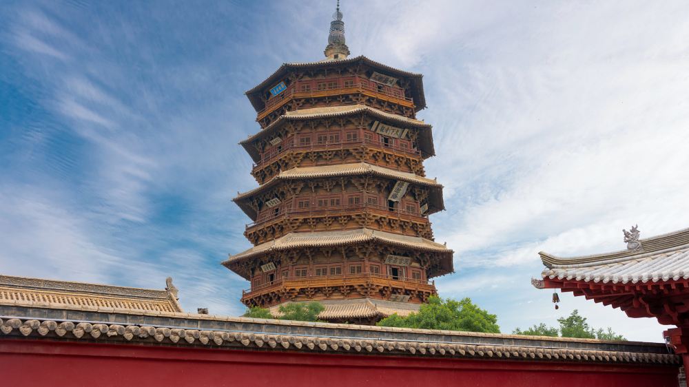 ▲ 应县木塔始建于1056年,距今已有近千年的历史。它与意大利比萨斜塔、巴黎埃菲尔铁塔并称为“世界三大奇塔” 六大看点:龙主题皇家寺塔、释迦佛、斗八藻井、壁画、匾额、斗拱 门票::50元/人 开放时间:8:00-18:00 参观建议:1-2小时 应县木塔拍照机位: 1、应县木塔景区正对面的商业街 2、木塔正后方进门右手边 3、钟楼旁边的红色的拱门 3、以钟楼屋檐为前景 4、木塔正面 5、钟楼旁边 6、木塔的屋檐