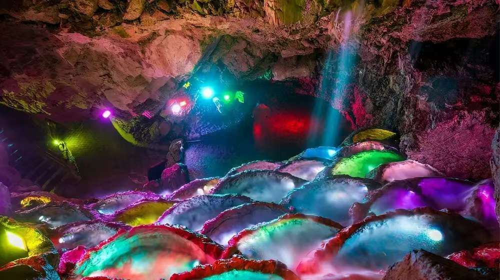 拥有独特的喀斯特溶洞景观。洞内钟乳石、石笋、石柱形态各异,还有三处瀑布、地下河道和罕见的地下钙华梯田。植被覆盖率达85%,负氧离子浓度达10万个/cm³,是天然氧吧。