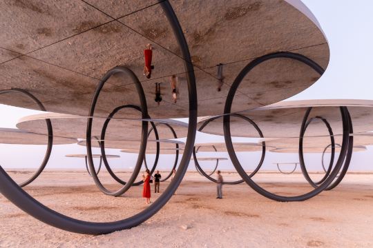 巨大的沙漠延绵数里,其中点缀着少许动物、沙漠植物和岩层的痕迹。“游荡于白日海面之影”引导着观览者进入其中,与环境零距离互动。这个艺术装置中的每一个天花板都装有巨型镜面,以此时刻反射着沙漠地面。艺术家希望观览者意识到当他们向上看时,他们其实也在向下看,从而邀请旅者思考他们与地面的联系。