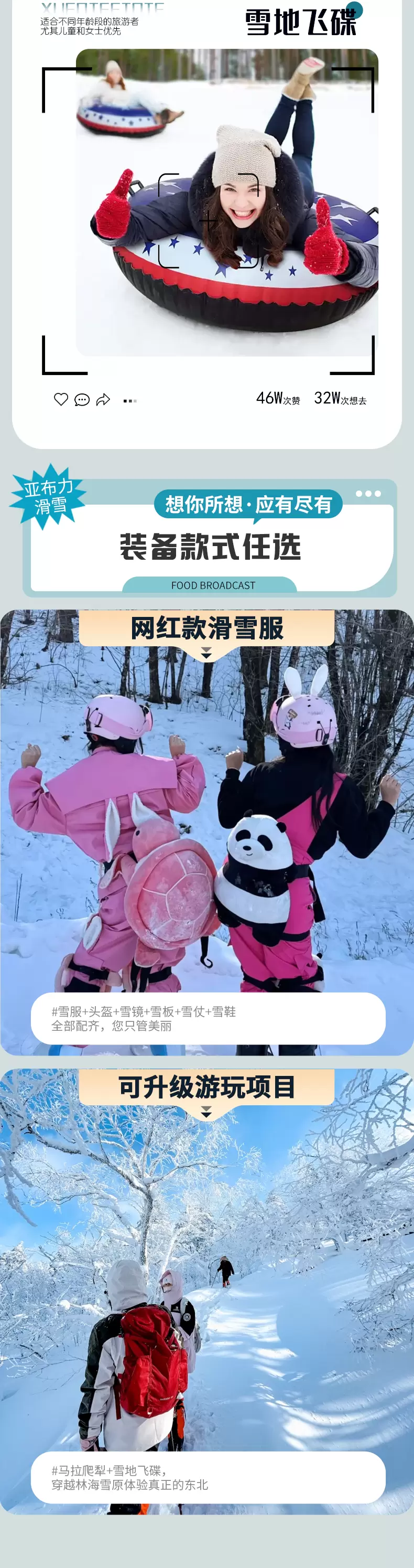 亚布力滑雪一日游【3小时滑雪【含雪鞋+雪板+雪仗+滑雪服+风镜+头盔】马拉爬犁+雪地飞碟】