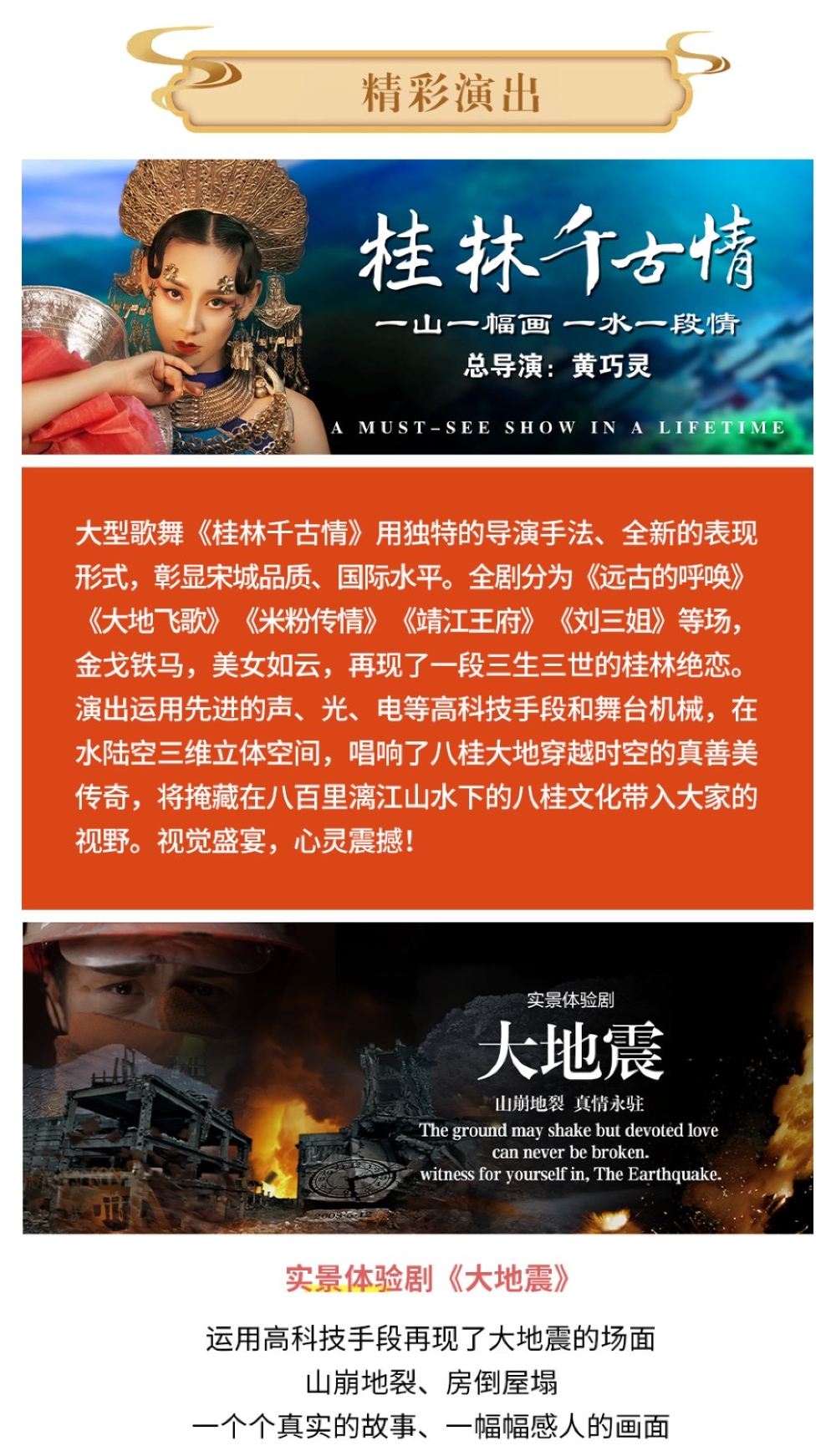 。2、《大地震》等剧院演出,景区将根据天气、现场情况等进行场次调整或取消。演出不对票入座,先到先得,座满即止,不保证所有游客都能看到。