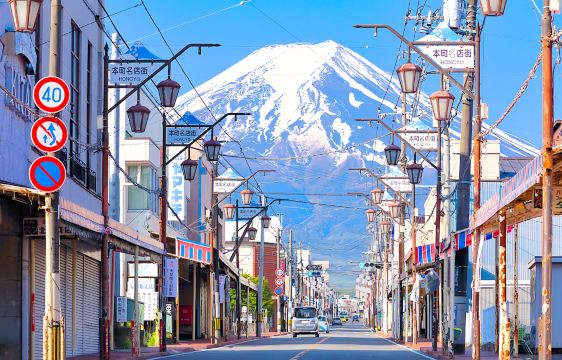 ▲ 【日川时计店】日川时计店前街道形成直通富士山的「天梯」视觉效果。需注意交通安全,感受富士吉田市井生活气息。