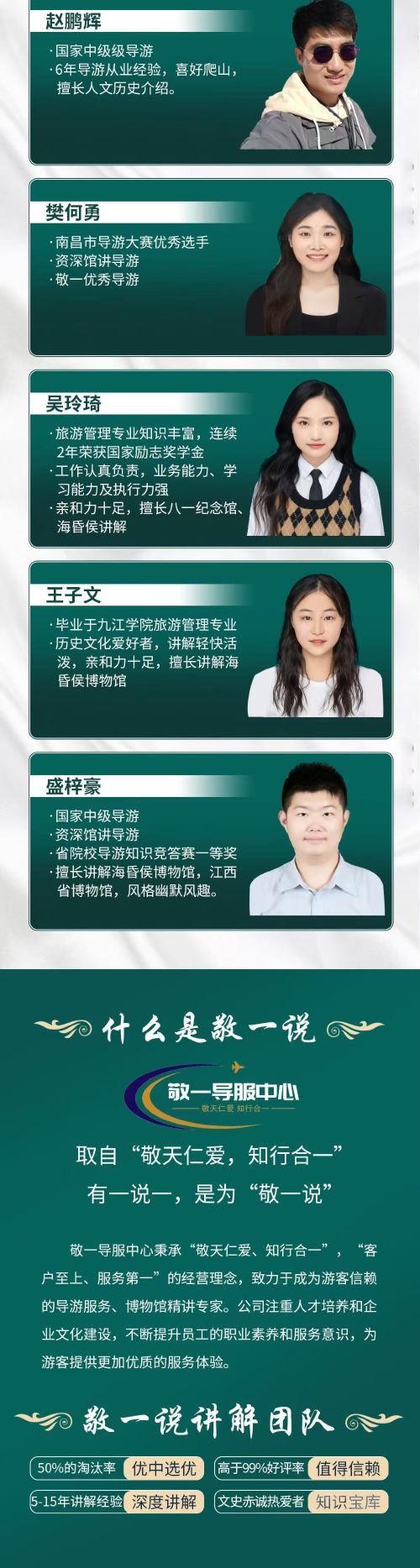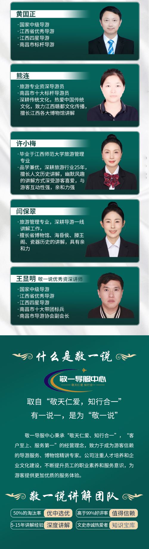 ▲ 一、企业概况 南昌敬壹旅游服务有限公司(敬一导服中心)是一家专注于导游服务企业,致力于为广大游客、旅行社提供专业、优质的导游服务。