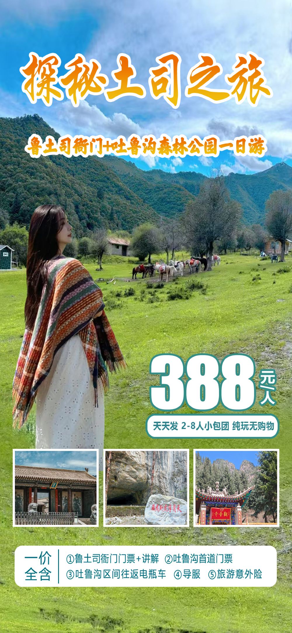 ▲ 【探秘土司之旅】 鲁土司衙门+吐鲁沟森林公园一日游 【费用不含餐/景区讲解】 【一价全含】 ①鲁土司衙门门票+讲解全含②吐鲁沟首道门票③吐鲁沟区间往返电瓶车④导服+旅游意外险 【行程介绍】兰州—连城鲁土司衙门—吐鲁沟—兰州全程约320km 1.07:30 兰州市区内统一接送!(超出兰州市区根据实际距离补车费) 2.参观【鲁土司衙门】(约2h),属藏传佛教格鲁派重要寺院 3.中餐后车赴吐鲁沟 4.参观【吐鲁沟森林公园】AAAA级景区(约3h)“华山之险”“峨 眉之秀”“青城 之幽”“九寨之奇”美誉