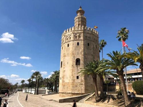 ▲ 黄金塔是塞维利亚辉煌的航海史的见证,这里曾经是那些满载着黄金白银从美洲回来的船只的终点。黄金塔因以金色瓷砖贴面而得名,现在瓷砖已经没有了,但在斜阳下仍显得金光闪闪。 塔身为等边12面体,每个面代表一个方位。 黄金塔建于1220年摩尔人统治时期,是一座军事瞭望塔,主要目的是监视从进犯河港的船只。后来曾作为监狱、仓库、邮局等使用,现在是黄金塔,展示古海图、古船模型及各种船头装饰。
