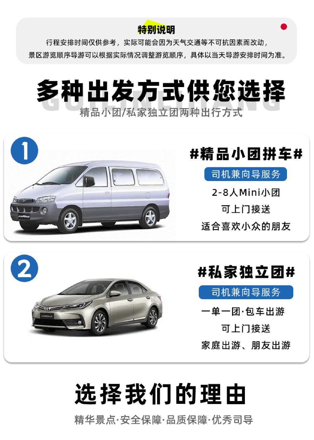 2、精品小团:真小团,1车不超过8人,如有单个家庭团体超过8人直接升级为私家独立团(根据人数安排车接待);私家独立团:时间玩法更灵活,景点可按需灵活调整,出发时间您做主。