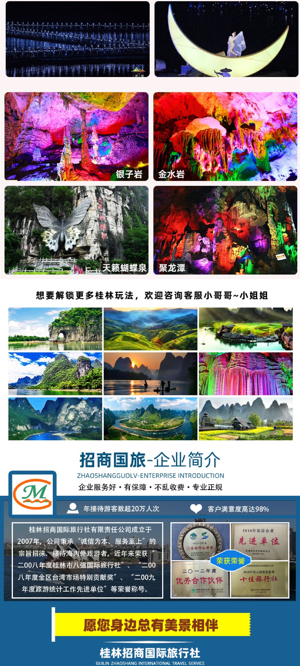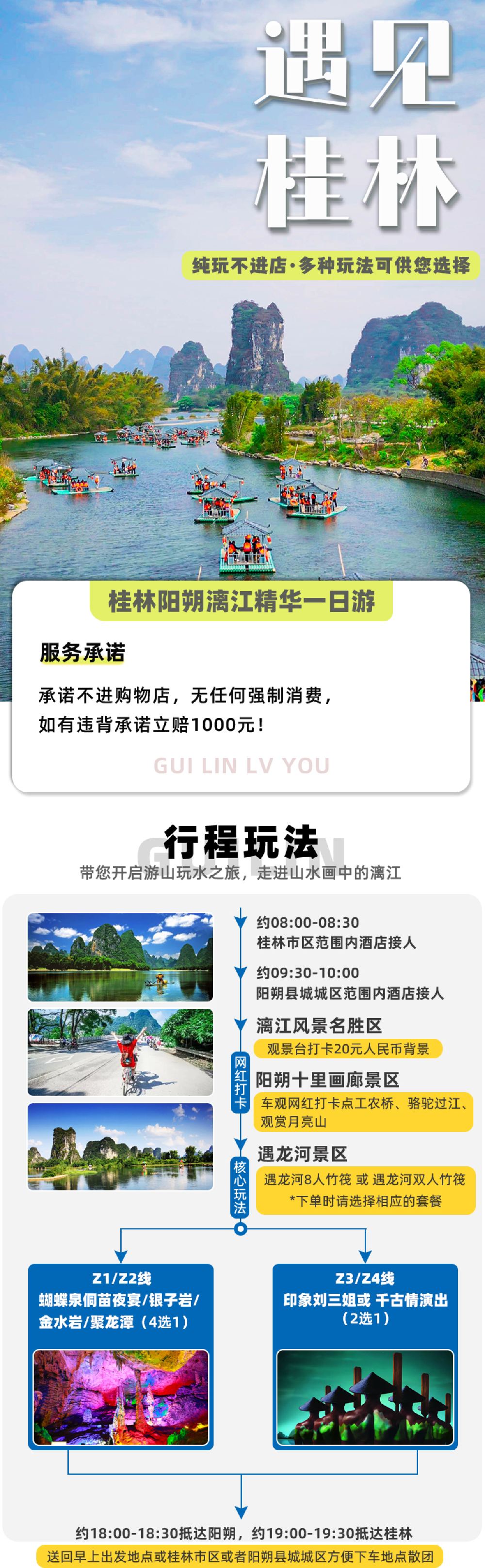 Z1线【遇龙河8人竹筏+漓江20元背景打卡+兴坪古镇+十里画廊+天籁·蝴蝶泉侗苗盛宴/银子岩/金水岩/聚龙潭(溶洞4选1)】