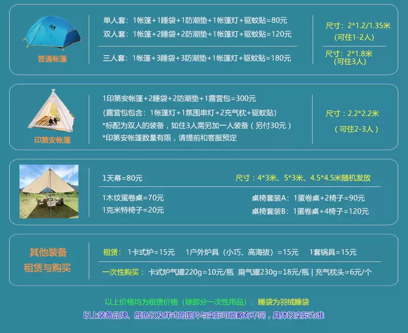 装备租赁:您可以自带装备,或俱乐部统一租赁,费用如下(请报名时提前预定并付款)