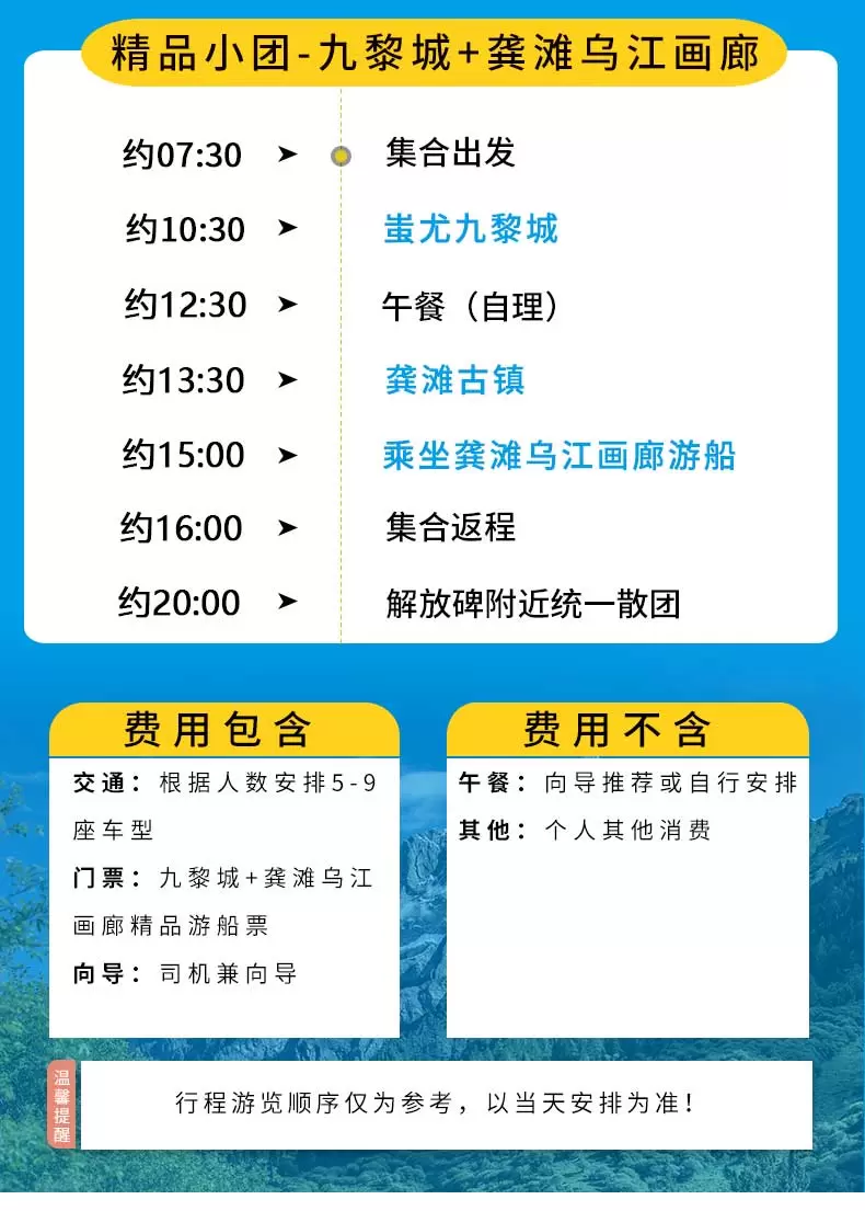 渝东南属于土苗文化聚集区,九黎城内和龚滩非遗文化长廊的出口设有由景区配套的非遗工艺品及地方特色商品展示区,该区域为景区配套设施,非我社安排的指定购物场所,您可根据自己爱好自由选择是否参观商品展示区。