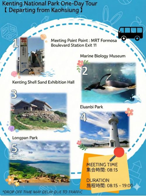 ▲ 【鹅銮鼻公园】 鹅銮鼻公园以灯塔驰名,园内为一珊瑚礁石灰岩地形;形成之原因乃由于沿海日光强,海水清澈,适于造礁珊瑚之成长,经地壳隆起而上升,受海浪侵蚀、雨水冲刷、强风吹袭、而成为目前巨礁林立、怪石嶙峋、奇峰与洞穴之奇特景观。园内步道纵横交错,宛如身入迷宫,计有好汉石、沧海亭、又一村、虬榕、幽谷、迎宾亭等据点,处处引人入胜。在公园北望,可看到蓝天碧海、绿树白砂、嶙峋礁石、以及台地尖峰等,此外还有矗立的琼麻花轴,穿插其间,构成一幅壮阔多姿的山海图画。 鹅銮鼻灯塔高21.4公尺,内设大型四等旋转透镜电