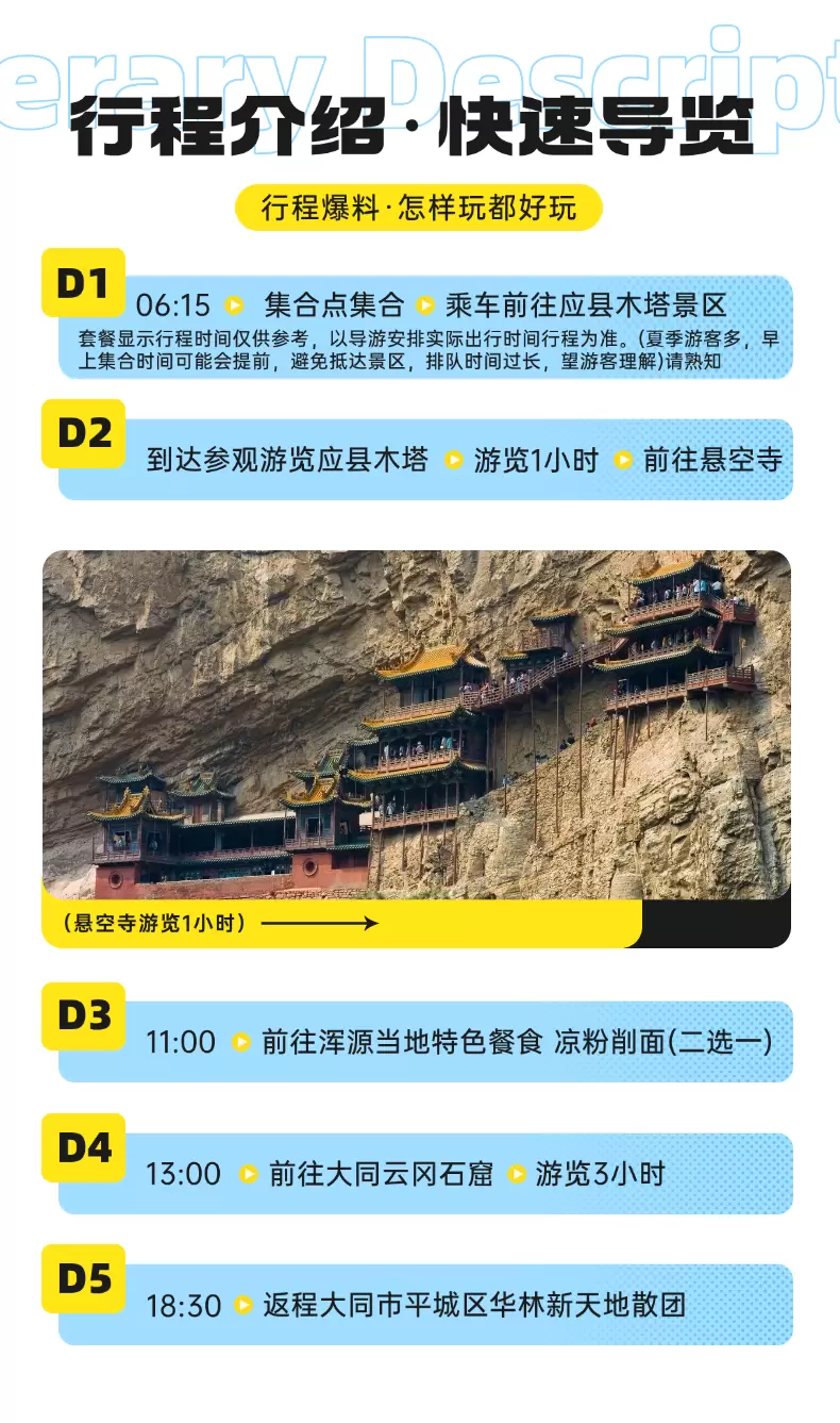 大同悬空寺+应县木塔景区+云冈石窟一日游【2+1陆地头等舱30人左右团|优秀导游全程讲解|赠送特色午餐】